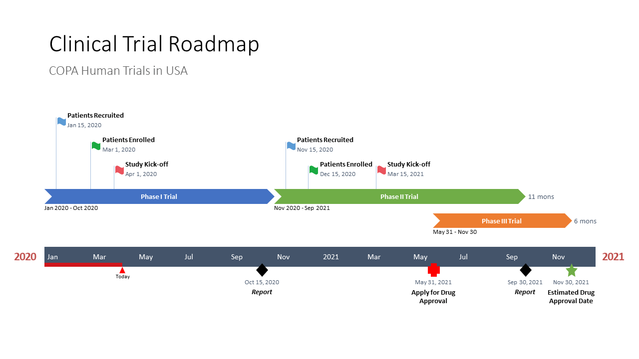 - The clinical trial roadmap was made in PowerPoint, which makes it easy to integrate in the next boardroom meeting with your stakeholders.