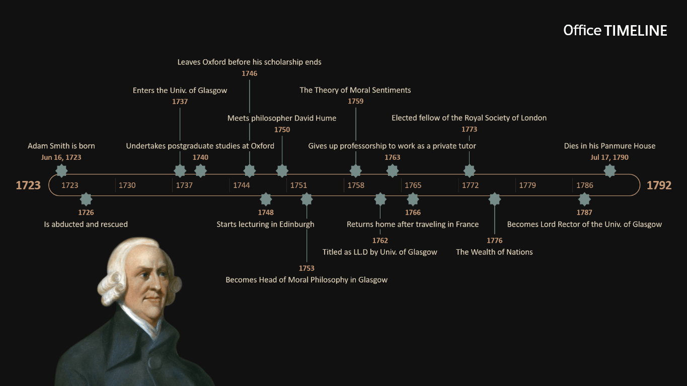 The Adam Smith chronology was designed with Office Timeline, a simple to use plugin for PowerPoint that enables the fast creation of impressive timelines, Gantt charts and other project visuals. The visual is free to copy and share, and can be easily updated or restyled using the free 14-day trial of the tool.
