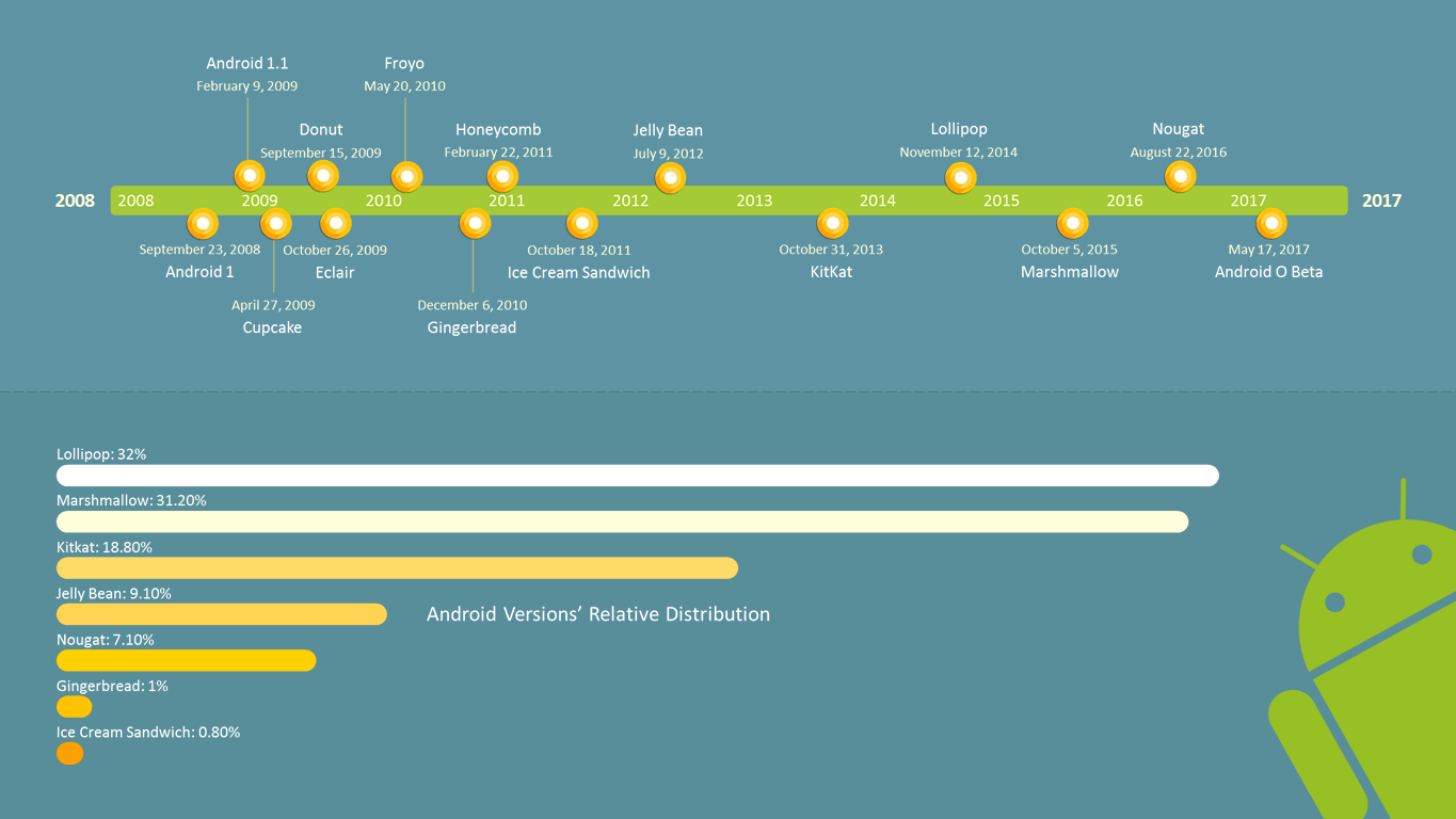 The Android Timeline illustrates all major versions of the mobile OS and their release dates, as well as an overview of their distribution among Android users, as reported by Google at the beginning of May. Variants with a market share lower than 0.1% were not included in the chart. As can be seen from the graphic, Lollipop and Marshmallow are the most popular platforms, each with a share of over 30%, while the relatively new Nougat reaches only 7.10%. Although Nougat’s percentage seems low, it is a considerable increase compared to the 4.10% it had in April 2017.