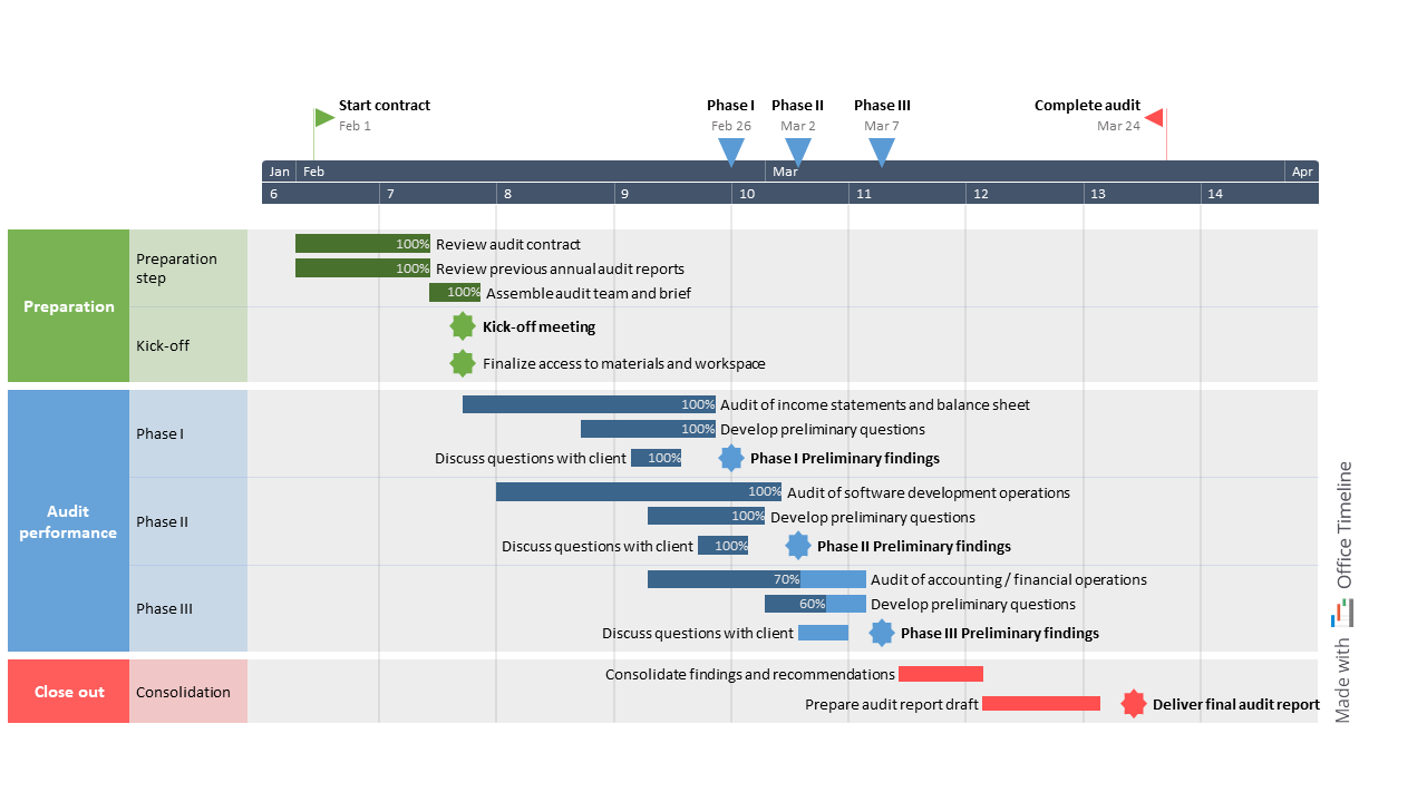 Overall, the engagement schedule Robert created with the Office Timeline tool helped him keep project sponsors updated and secure the continued funding of the engagement from start to finish.