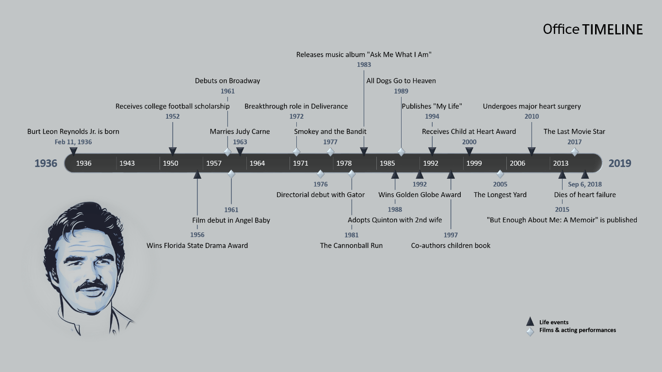 The Burt Reynolds chronology was created with Office Timeline, a user-friendly plugin for Powerpoint which helps you to easily and quickly design elegant timelines, Gantt charts and other visuals. You can copy and share the image for free, and further restyle it with the Plus version of the add-in.