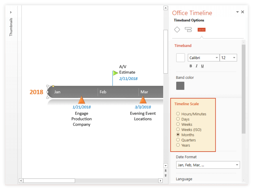 2. With the timeband selected, go to the Timeline Scale section in the Office Timeline Style Pane on the right (pictured below). Here, pick a new timescale from the options available (Hours/Minutes, Days, Weeks, Weeks (ISO), Quarters or Years). The add-in will automatically update your timeline. You will also find the language control for the timeband here. Use it to change the language of your timeband’s scale if you have an international audience.