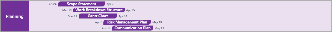 - Gantt chart – a project management visual, used to illustrate the project timeline and plan out the tasks identified in the WBS diagram. Several apps in the Microsoft Office suite allow making a Gantt chart but generally require a lot of painstaking design work because they lack templates. Most project management professionals prefer to use a quick and easy Gantt chart maker with embedded templates in order to save time. Check out our other blog post about the best apps for this purpose to find out more.