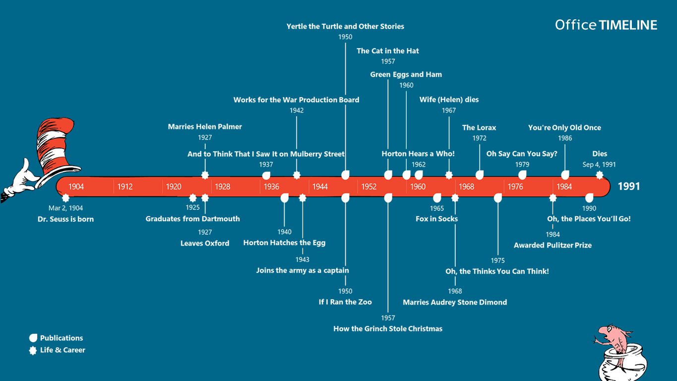 The Dr. Seuss chronology was created with Office Timeline, a simple-to-use PowerPoint plugin that enables users to quickly generate historical timelines, visual plans and schedules, Gantt charts, or other similar graphics. The image is free to copy and share and can be updated or restyled easily using the Plus version of the tool.