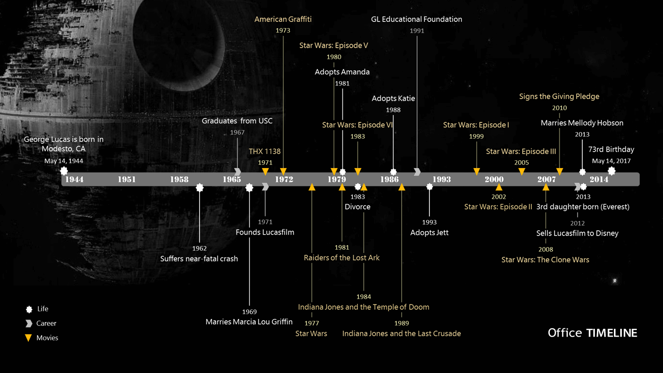 The George Lucas chronology was created in PowerPoint using the Office Timeline add-in and you can download it as a PowerPoint slide free of charge. The free edition of the add-in is perfect if you’re just getting started. To quickly build professional timelines and Gantt charts from scratch, we recommend using the Pro version of the tool, which brings more powerful features and advanced customization options.