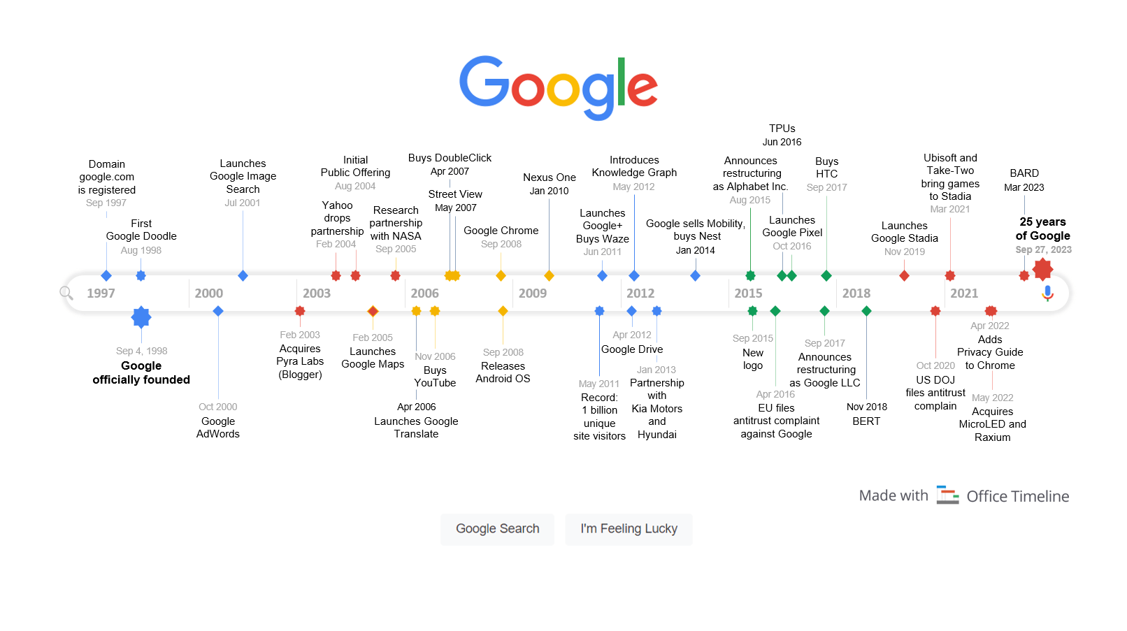 The Google chronology was designed in PowerPoint using Office Timeline, a simple add-in that allows users to quickly create eye-catching timelines, Gantt charts and other similar graphics.