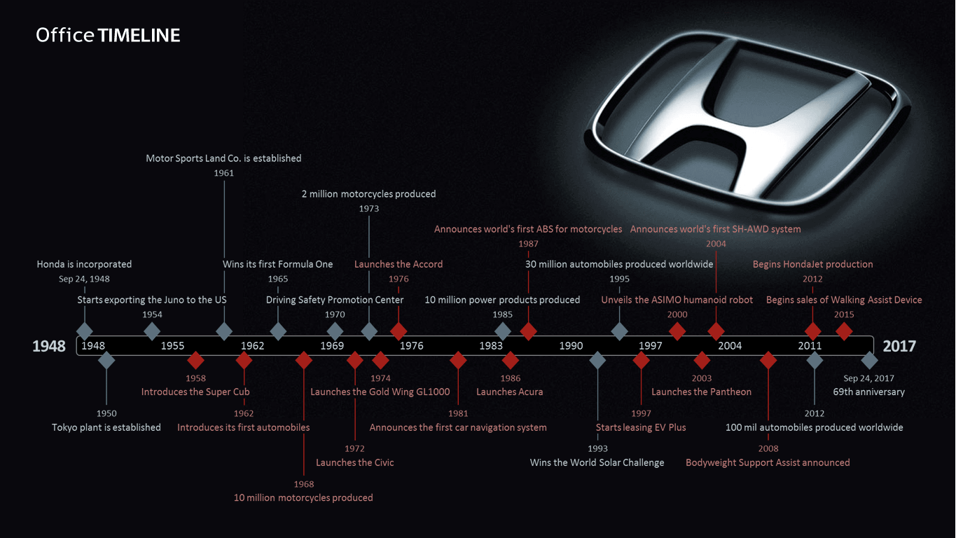 The Honda chronology was created using the Office Timeline PowerPoint plug-in and can be copied and distributed for personal or public use. To edit the graphic or create similar ones, we recommend using the Pro+ version of the tool, which comes with numerous customization options and powerful features to help you create impressive timelines fast.