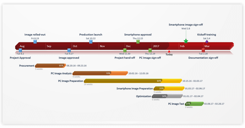 One of the best visual ways to present project status to clients is to use a Gantt chart that also contains percent complete for each task, just like the one below. It was created with Office Timeline Online which is an easy Gantt chart maker.