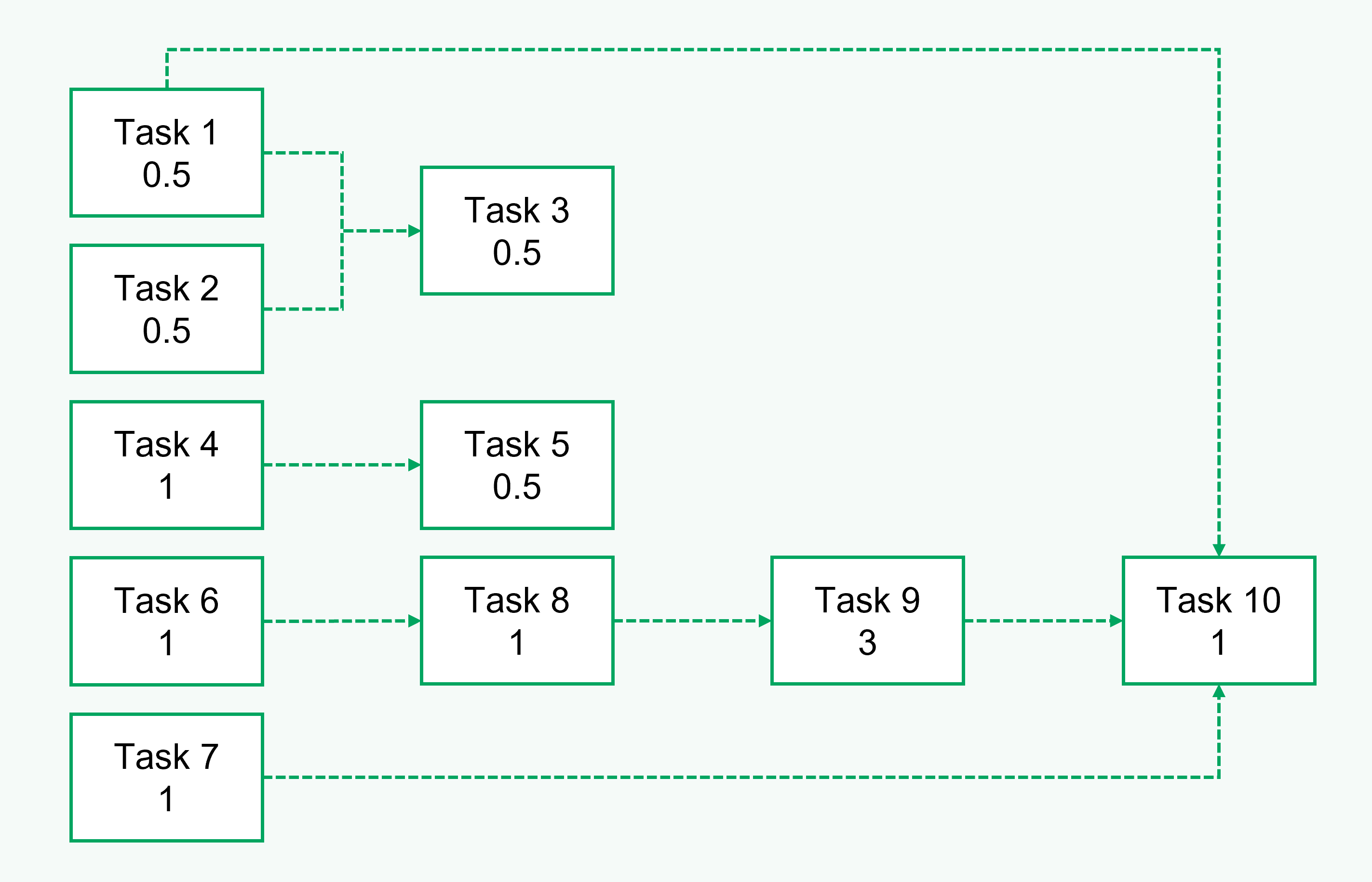 The list of dependent tasks is known as an activity sequence, which will be used to outline the critical path. Based on this, you can also recognize any work that can be done in parallel. For instance, in our case, Task 2, Task 4, Task 6, and Task 7 can run at the same time with Task 1, as they don’t rely on any previous activities.