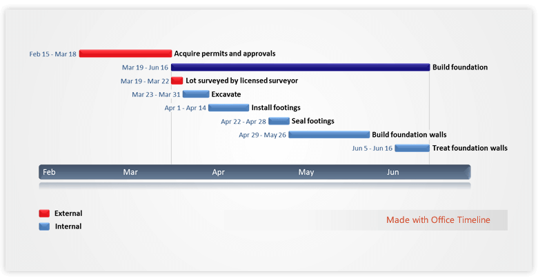 External dependencies define those tasks that are dependent on outside influences, such as vendors, regulatory agencies, or even other projects. PMs and project teams don’t usually have much control (if any) over these dependencies. For instance, before construction workers can start building, renovating or demolishing, it is first necessary to obtain approvals from local authorities. The construction company cannot influence how long it will take the authorities to grant said approvals.