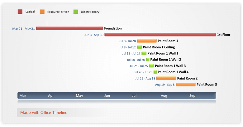 - Preferential or discretionary dependencies refer to tasks that could be completed differently, but their implementation is decided by the team or PM based on convenience or guided by best practices. In our construction example, a room’s ceiling and walls can be painted in any order, but the painter prefers to finish the ceiling first because it”s more difficult to work on and he wants to get it out of the way.