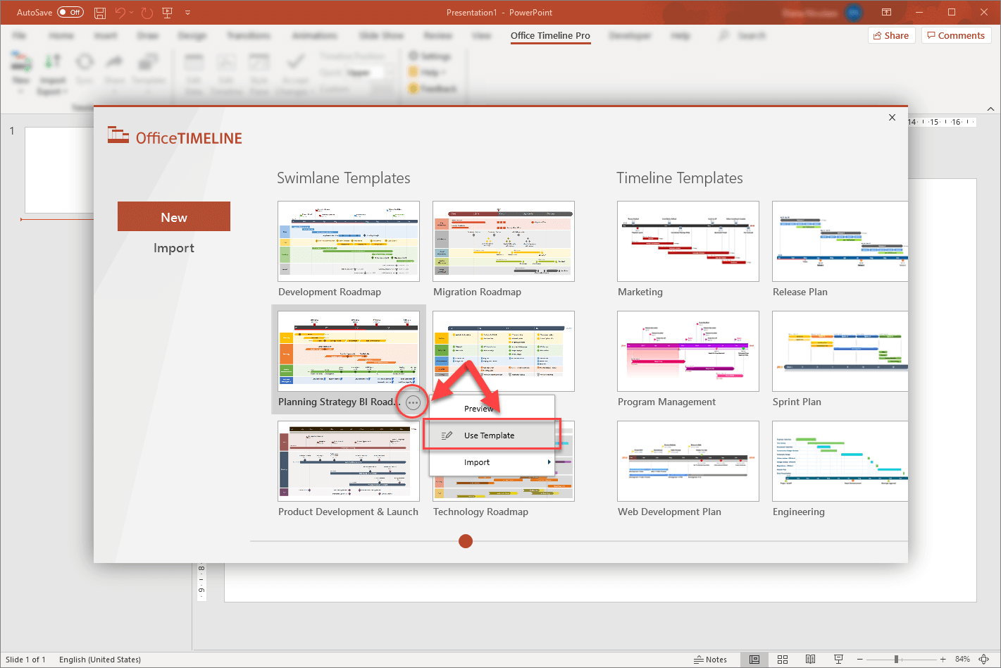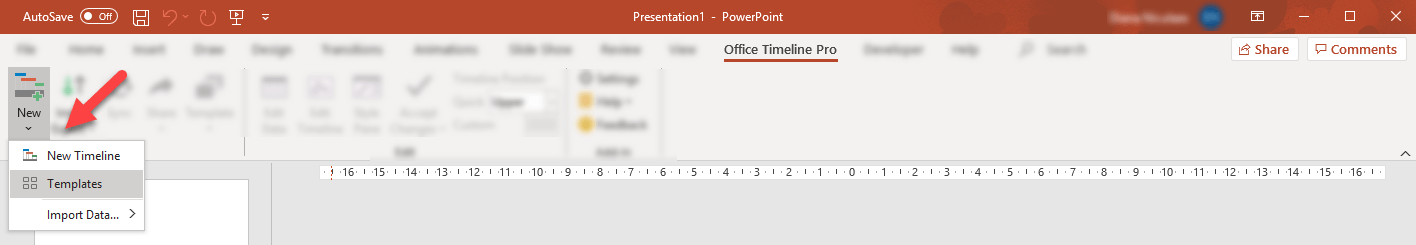 - Inside PowerPoint, go to the Office Timeline tab, and then click on the New icon. From the dropdown menu, choose Templates.