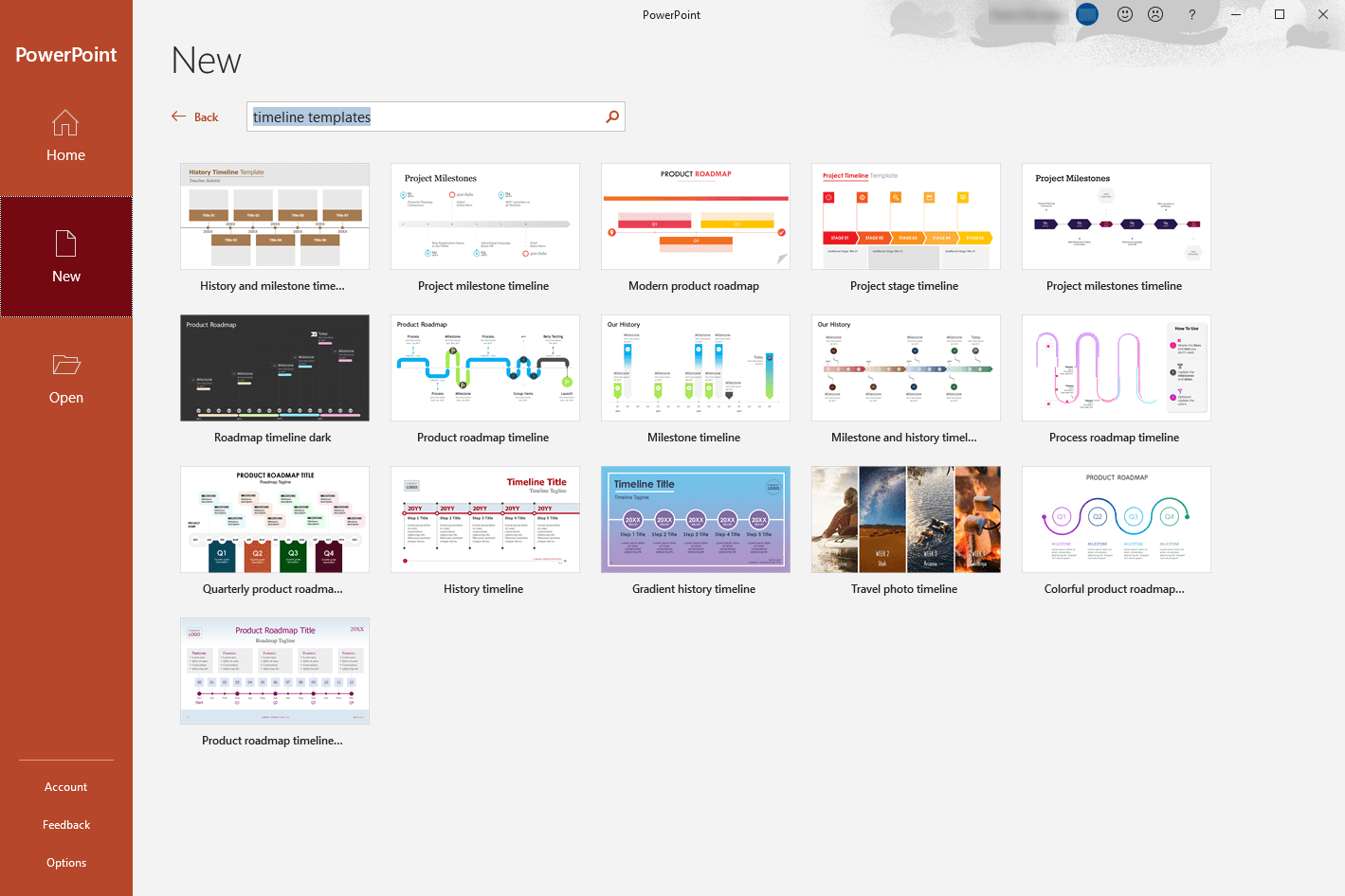 - Type ”timeline template” in the Search box at the top of the page and press Enter.