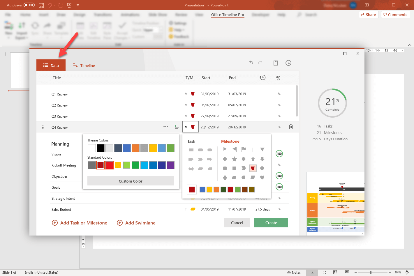 Once created, the timeline can be quickly styled further or updated automatically with the help of Office Timeline. For example, you can change shapes, colors, timescale and dates on the fly, or reposition items on the timeline using the add-in’s intuitive drag & drop interface. Not only that, but Office Timeline also allows you to create and save your own custom templates that you can use for future work.