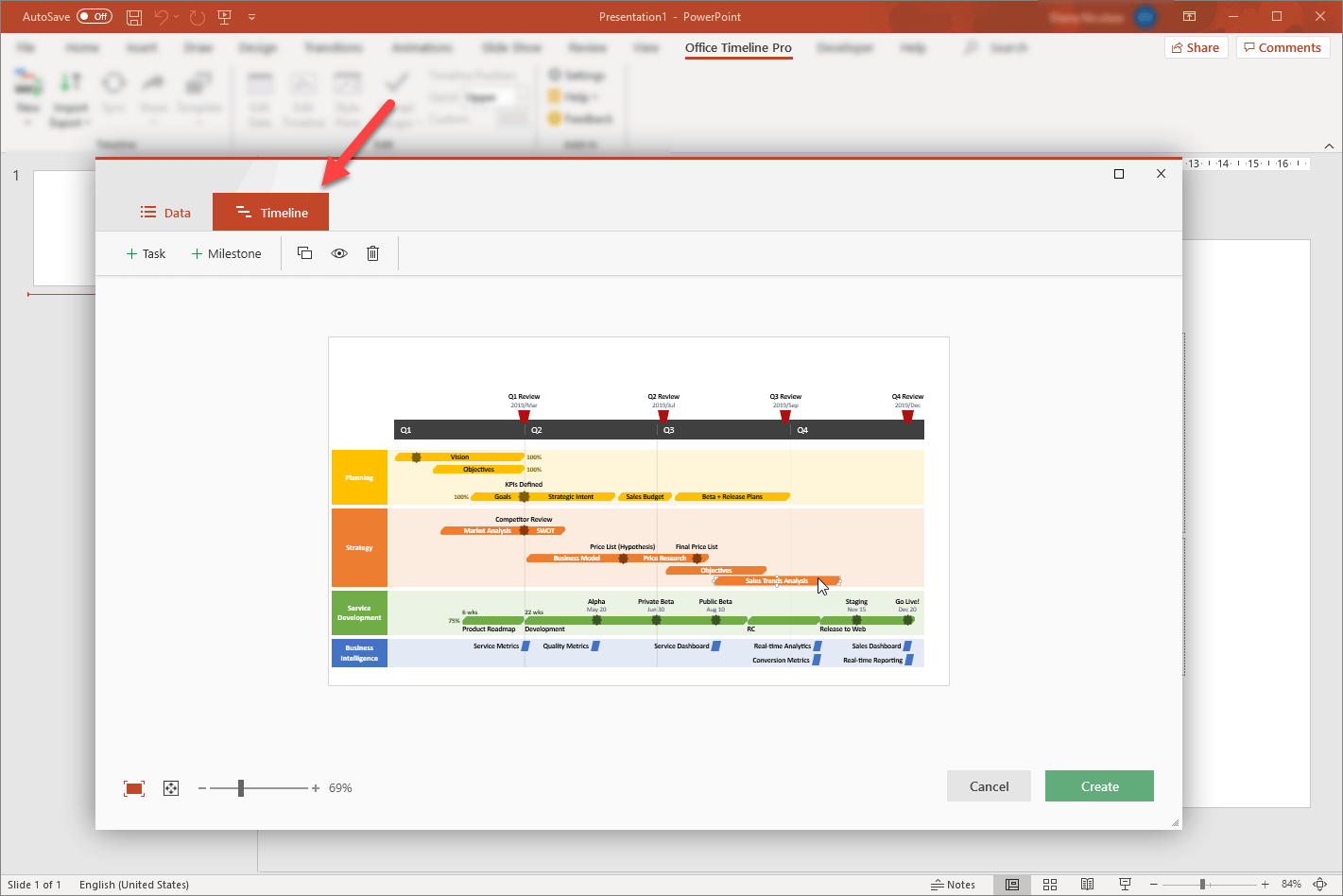 With a variety of features to enhance a presentation, PowerPoint does include timeline templates as well. You can create a timeline either using PowerPoint’s native templates or the more advanced ones which come with the free PowerPoint plugin called Office Timeline. Below, we’ll explain how both alternatives work.