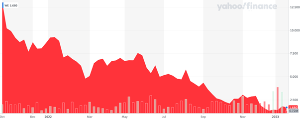 WeWork is a leading provider of co-working spaces for businesses of all sizes, from start-ups to large corporations, with a global presence of over 700 offices in more than 35 countries. Despite its prominent position in the market, the company is struggling with financial challenges, which has led to a significant drop in its share price of over 80% since its IPO through a Special Purpose Acquisition Company (SPAC) in October 2021.