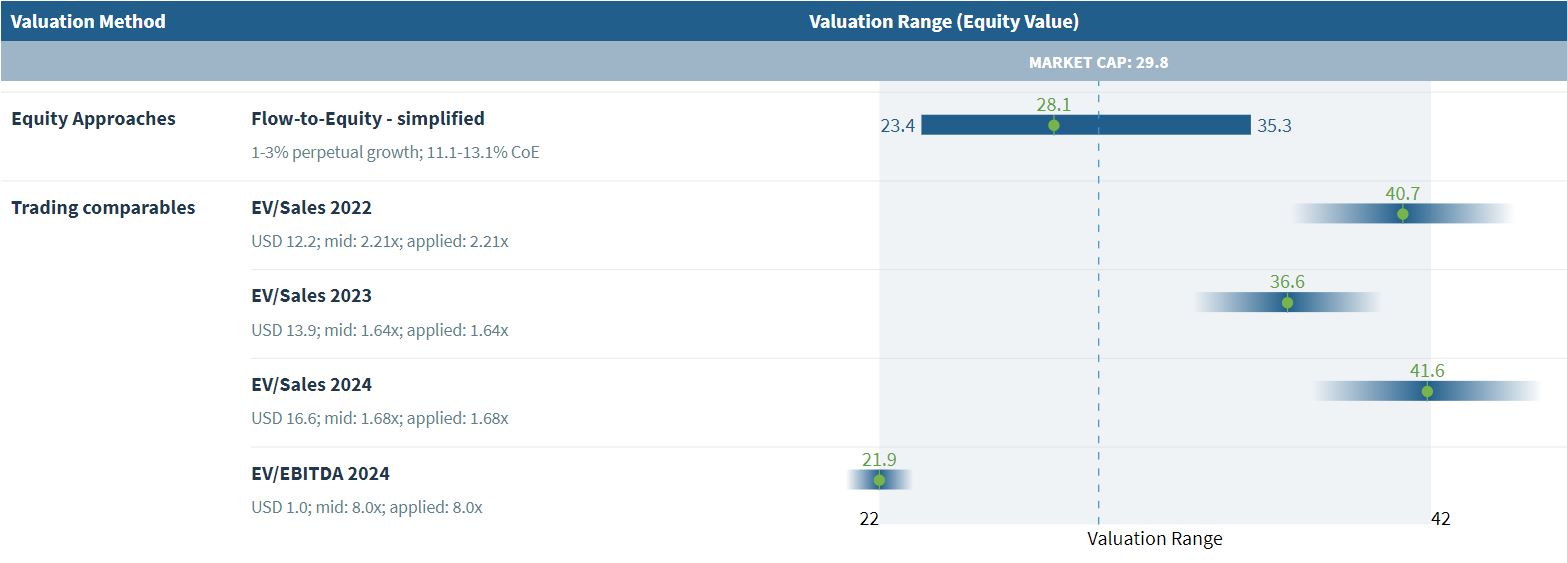 The Trading Comparables analysis resulted in a valuation range of $21.9 billion to $41.6 billion by applying the observed multiple EV/EBITDA for 2024 and EV/Sales. Due to the company being loss-making, P/E multiples could not be applied. For our Trading Comparables we selected similar peers such as Tencent, Alibaba and NetEase.