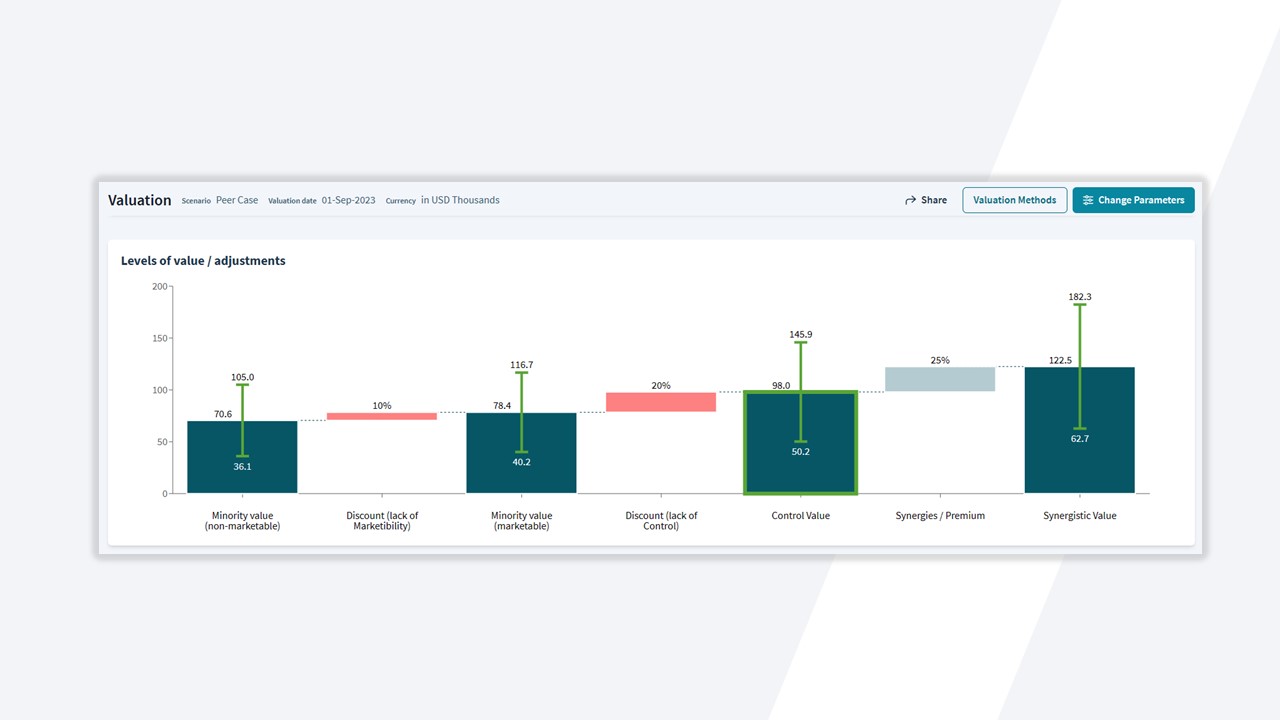 What? Introducing a new ‘levels of value’ reporting graph that automatically adjusts company value for minority value (non-marketable & marketable), control value, and synergistic value.