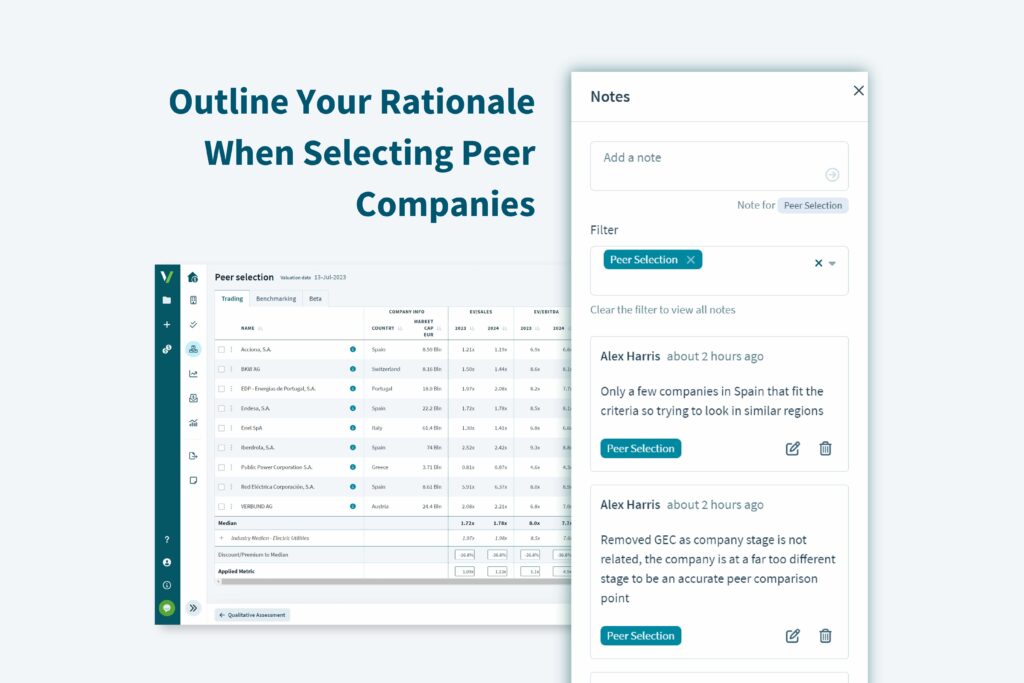 Users can take notes at various stages of the valuation process, including the qualitative assessment, peer choice, valuation methodology selection, and parameter adjustments.