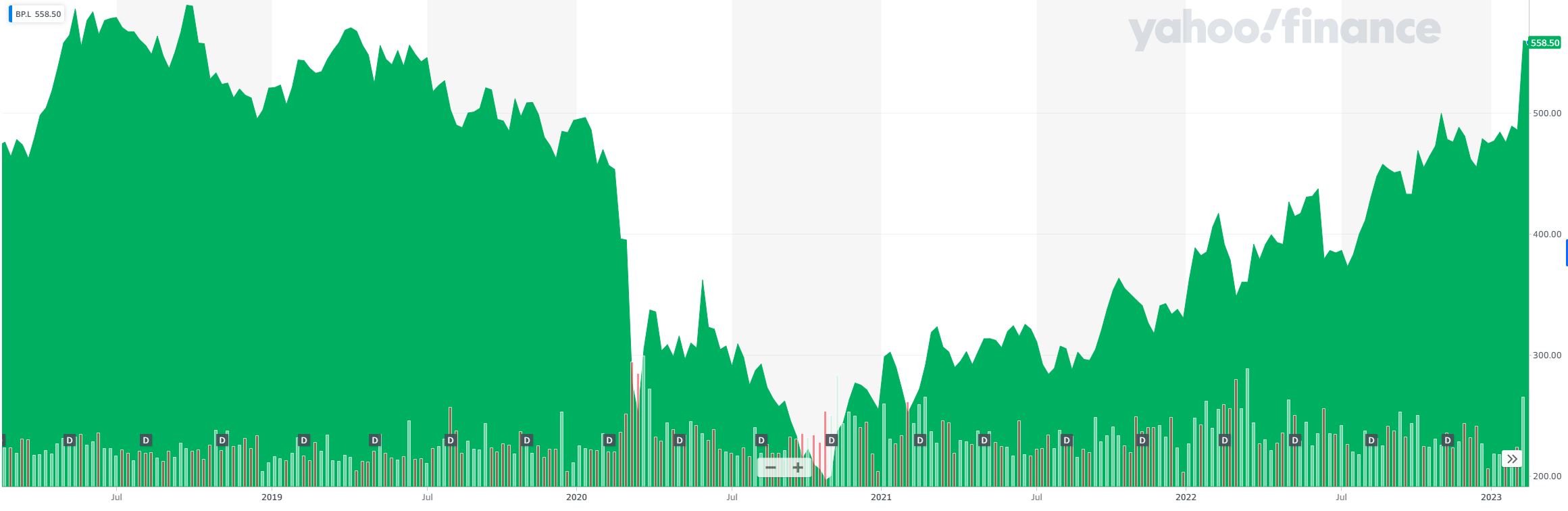 BP had tumultuous times over the last five years on the London Stock Exchange. In early 2018 the company traded at GBP 4.7 (USD 5.6). After the global drop-off in oil demand due to Covid-19, the share price fell to GBP 2.0 (2.4 USD). Since then the share price has risen steadily, fuelled by higher prices due to supply constraints created by the Ukraine war. The current share price is GBP 5.6 (USD 6.8).