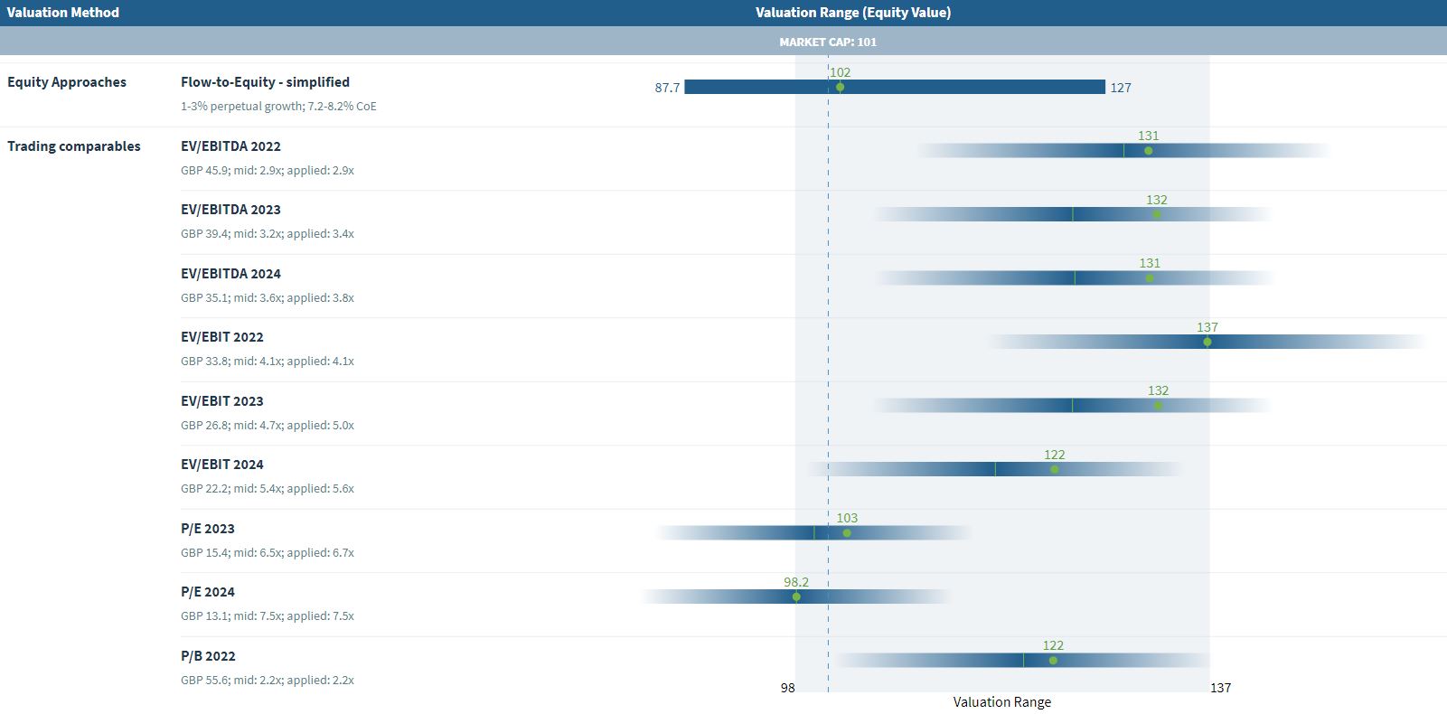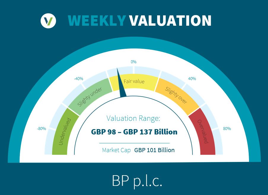 We analyzed BP p.l.c. by using the Discounted Cash Flow method, specifically our Flow-to-Equity approach, as well as a Trading Comparables analysis. The Flow-to-Equity analysis produced a value of GBP 102 (USD 123) billion using a Cost of Equity of 7.7%.