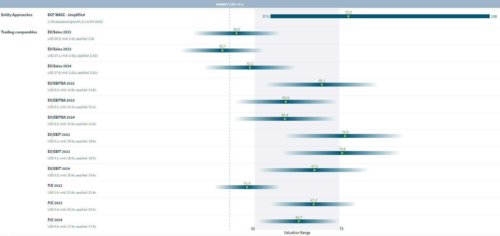 The Trading Comparables analysis resulted in a valuation range of USD 45.7 billion to USD 74.5 billion by applying the observed trading multiples EV/Sales, EV/EBITDA, EV/EBIT and P/E. For our Trading Comparables we selected similar peers such as The Hain Celestial Group, Inc., The Simply Good Foods Company and Campbell Soup Company.