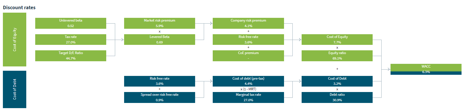 We analyzed KHC by using the Discounted Cash Flow method, specifically our DCF WACC approach, as well as a Trading Comparables analysis. The Discounted Cash Flow analysis produced a value of USD 75.3 billion using a WACC of 6.3%.