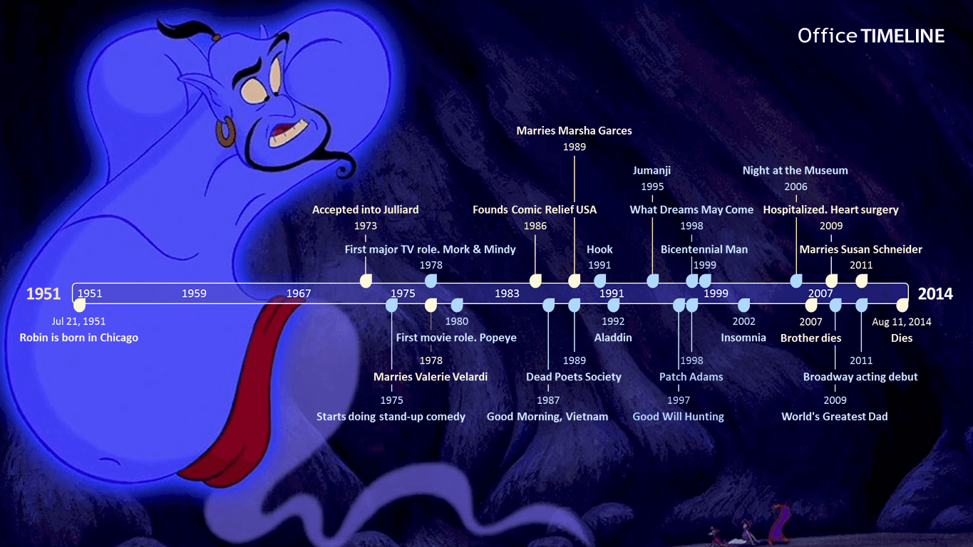 The Robin Williams chronology was created with the help of Office Timeline, an add-in for PowerPoint that allows users to generate timelines, Gantt charts and other visuals fast and easily. The image is free to copy, modify or share and can be easily edited or updated using the PowerPoint timeline maker.