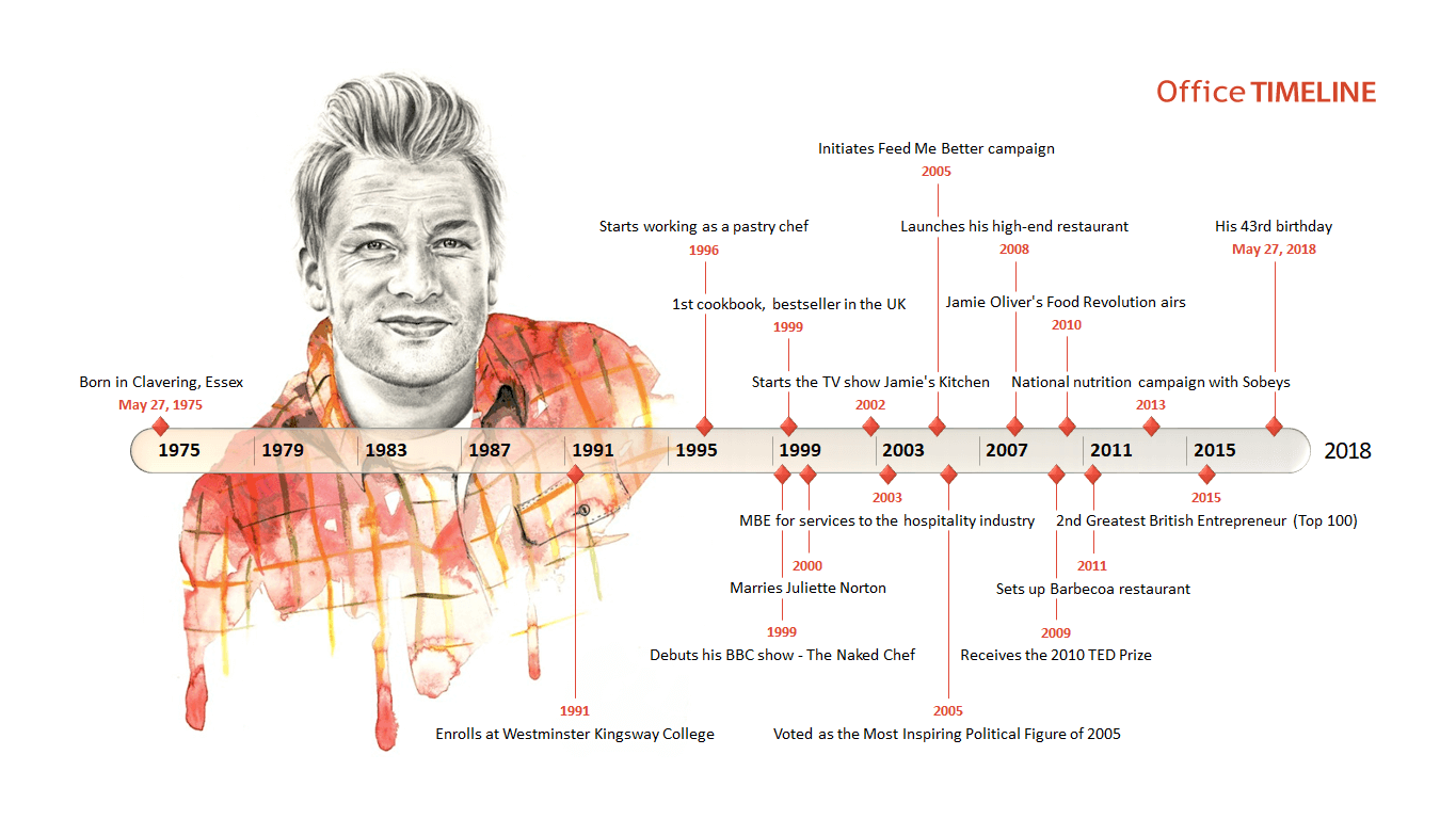 The Jamie Oliver chronology was designed using Office Timeline, an add-in for PowerPoint that helps you create professional timelines, Gantt charts and project visuals effortlessly. The visual is free to copy and share, and can be easily updated or restyled using the free 14-day trial of the tool.