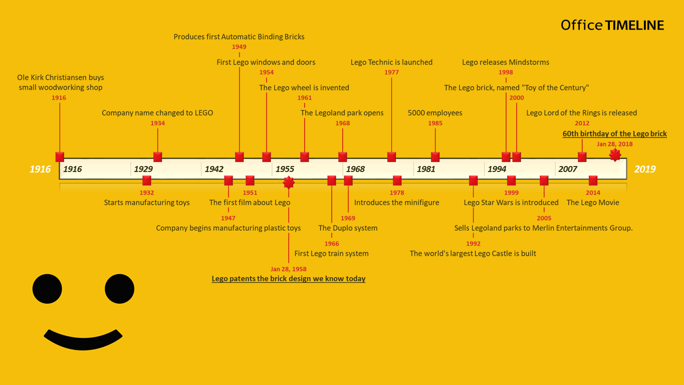 The Lego chronology was built with Office Timeline, a light but powerful tool that plugs into PowerPoint and enables users to easily build eye-catching visual schedules, timelines, Gantt charts and other similar graphics. To edit the image or create new ones fast, we recommend using Office Timeline Plus edition.