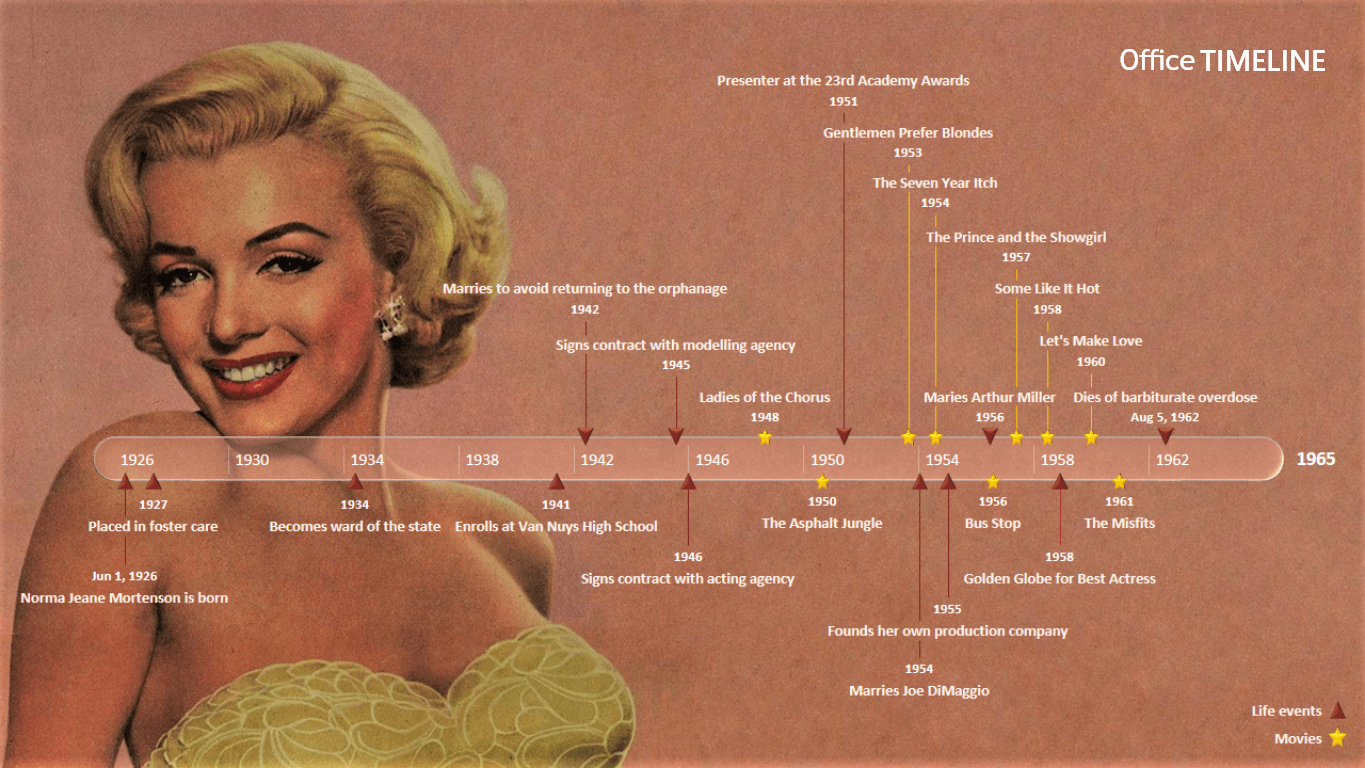 The Marilyn Monroe chronology was built with Office Timeline, a simple to use yet efficient PowerPoint plugin that helps you generate impressive project schedules, timelines and other similar visuals with only a few clicks. The image is free to copy and share and can be edited or restyled using the free 14-day trial of the tool.