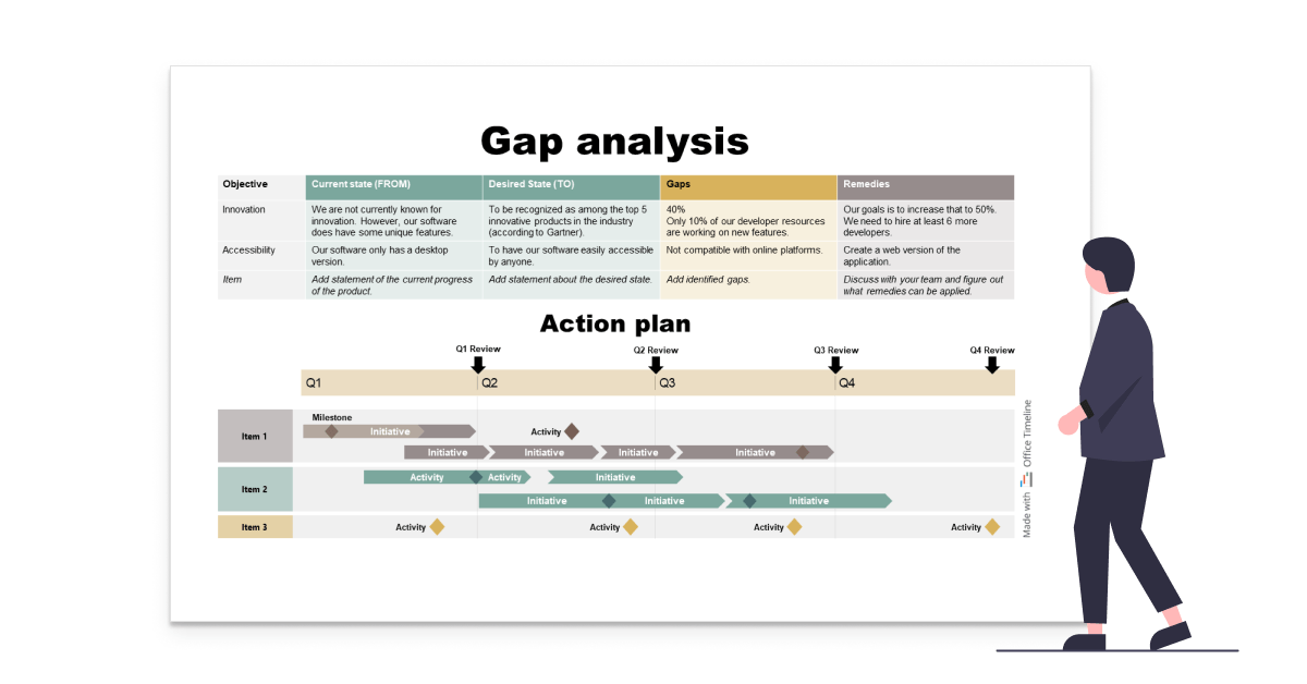 To help you with developing an action plan once you’ve complete the gap analysis, we have created this downloadable PowerPoint template for gap analysis, which you can download free of charge, using Office Timeline. You can edit the fields and colors to match your company’s branding directly in PowerPoint, but it’s much faster and easier to do so with our add-in.