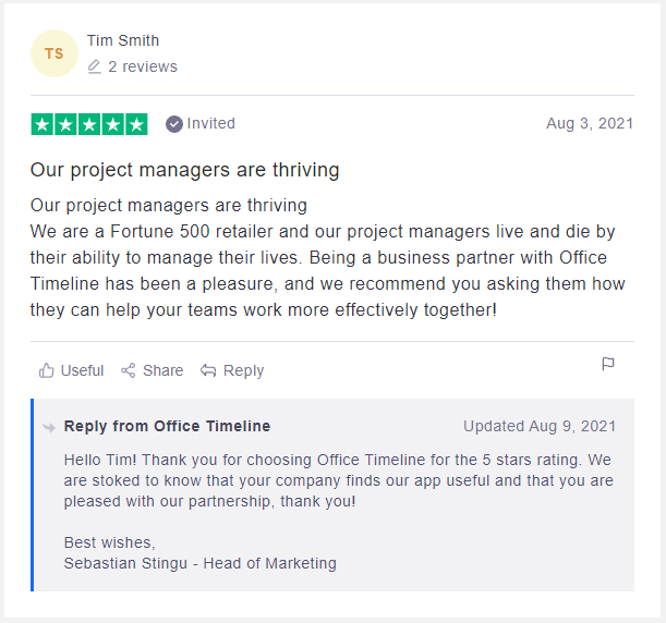 Much like a trusted friend’s advice or recommendation can influence our decisions, so can our customers’ reviews impact a prospect’s opinion. Testimonials and ratings left by Office Timeline users can help a non-user decide whether to give our product a try. What better input can you get on a product other than the one provided by someone who actually used it?