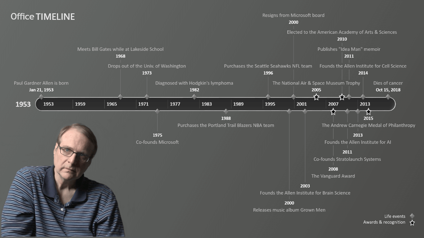 The Paul Allen chronology was created with Office Timeline, a simple yet effective PowerPoint plugin that allows users to create impressive timelines, Gantt charts and other similar visuals with only a few clicks. The slide is free to copy and share, and can be edited or updated using the Plus version of the add-in.