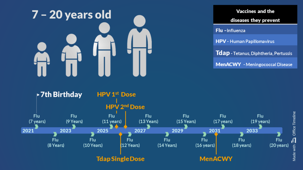 In spite of his tantrums, protests and negotiations, Johnny’s parents took him to get all the vaccines recommended by his pediatrician within the proper intervals. The good news is that Johnny won’t need to get extra doses for long lasting immunity. The only immunization shots still on the list – apart from the yearly flu shots – are Tdap, HPV and the meningococcal conjucate MenACWY. Let’s see what the timeline would look like: