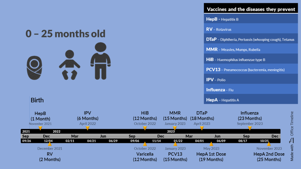Johnny isn’t a huge fan of needles and doesn’t think being slapped on the bottom is the best welcome for someone who’s just been born. Nonetheless, Johnny still has a lot to learn about the world and for now, he must rely on the experience of his parents to guide his first steps. Over the next months, he will receive a few immunization shots. Their role is to ensure his tiny immune system is equipped to handle dangerous pathogens, by having a threat response protocol at the ready. Here’s a timeline of Johnny’s vaccinations during his first 25 months on Earth:
