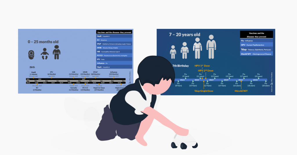 In short, what we’re providing here is a general overview of the main types of vaccines that are recommended under ideal conditions and the optimal dates of administration. Do note that missing a shot is not the end of the world; you can reschedule them for later dates under the guidelines listed by the CDC, WHO and your medical practitioner. However, due to the highly specific nature of each situation, we won’t be going into that. As a side note, you can always download our vaccination timelines and replace the default data with the vaccination details established by your doctor.