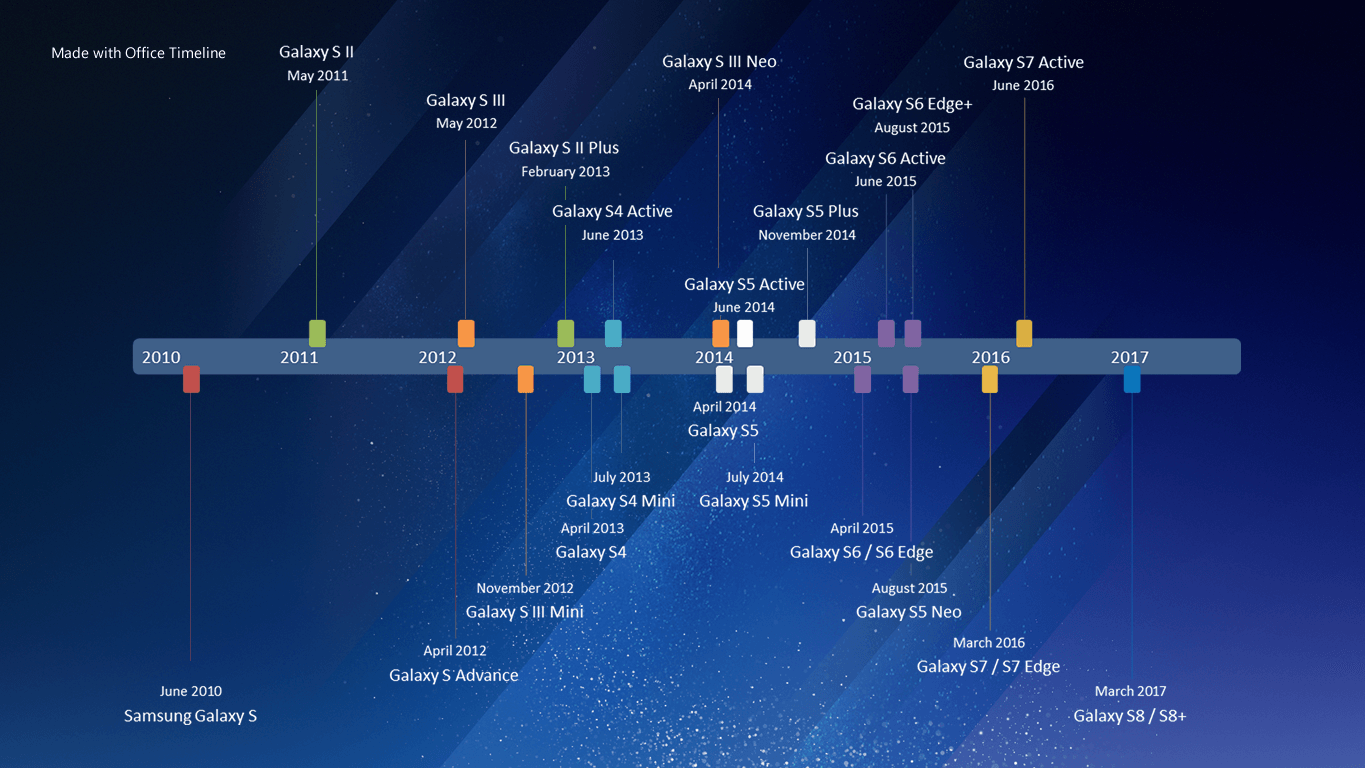 The Samsung Galaxy S chronology was built in PowerPoint using Office Timeline, an add-in that helps users create and share beautiful timelines and Gantt charts in a matter of minutes. The Free Edition is a light but fully functional timeline maker recommended for personal or academic use, while the Plus Edition introduces more customization options and advanced features, ideal for professional presentations and reports.