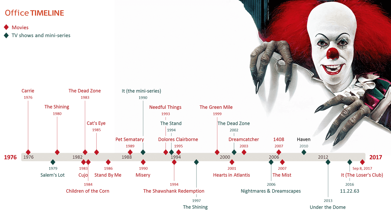 The Stephen King chronology was created with Office Timeline, a fast and simple tool that allows users to easily build Gantt charts, timelines and other visuals straight inside PowerPoint. The image is free to copy, modify and reproduce for personal or public use and can be easily updated using the Plus version of the plug-in.