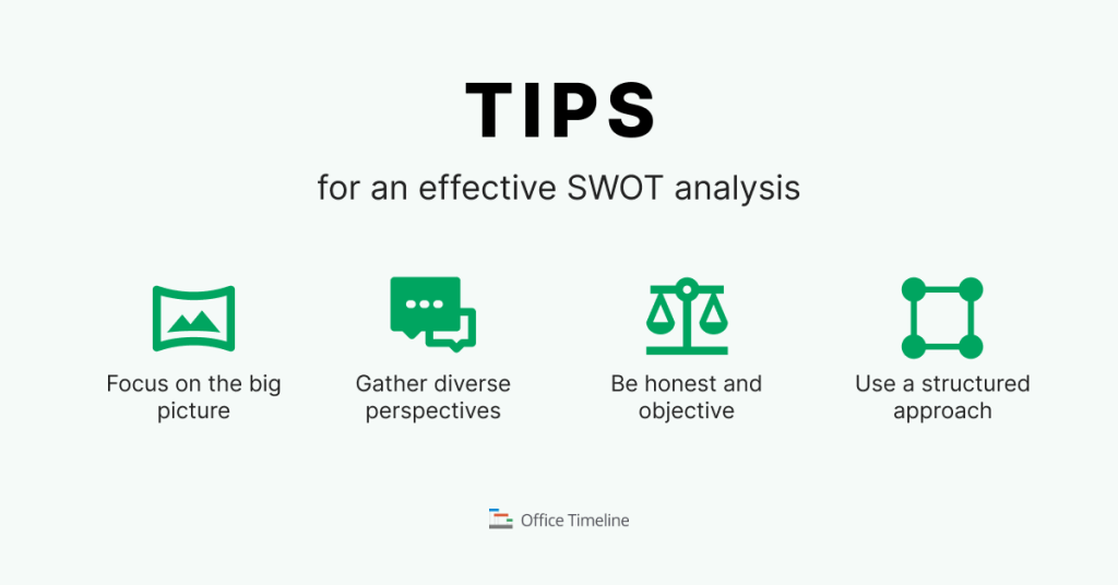 Since a SWOT analysis is a complex process, one can easily overlook critical aspects. We’ve thought of some tips that might help minimize this risk and ensure a more structured and objective analysis: