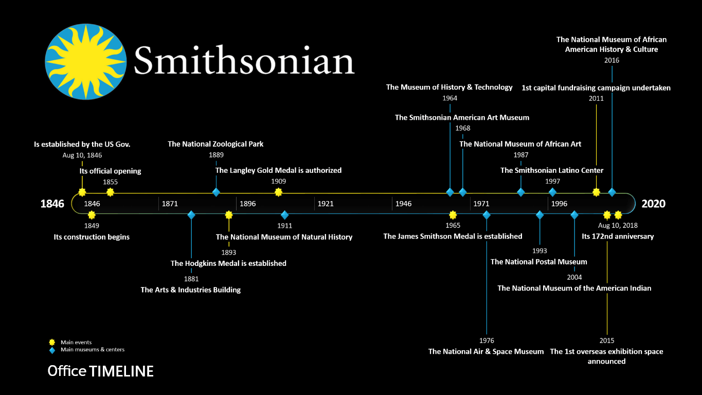 The Smithsonian Institution chronology was created with Office Timeline, a lightweight plugin for PowerPoint which helps you build stylish timelines, Gantt charts, project schedules and other similar visuals almost instantly. Using the Plus version of the tool, you can further update and style this slide, which is free to copy and share.