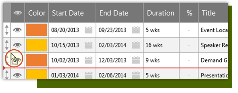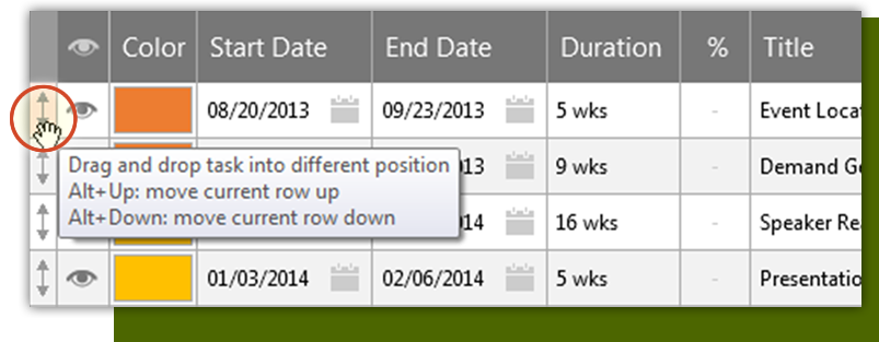 As you drag the row up or down, a red guideline indicates where that row will be positioned when you drop it. You can also quick-sort the entire task table by simply clicking on the Start Date, End Date or Title column headers.