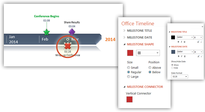 Click on a Milestone marker to change is shape, size and color.  From here you can also format your milestones font, date, and the color of its connector.