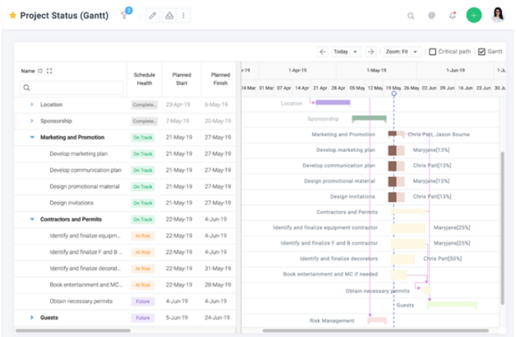 - Auto-scheduling: also known as dependency tracking, this functionality allows the automatic adjustment and recalculation of all downstream activities based on their dependencies when previous tasks undergo changes.
