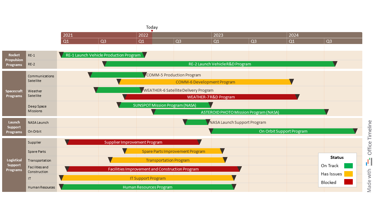 So this time, he has chosen a more user-friendly alternative — the Office Timeline tool — to import the MS Project data into PowerPoint and create a high-level schedule on one slide. He first groups individual programs by the company division responsible (e.g., spacecraft, logistics, launch support, etc.) to help improve work quality and delivery accountability. Then he adds milestones to call attention to the start and finish dates of each program.