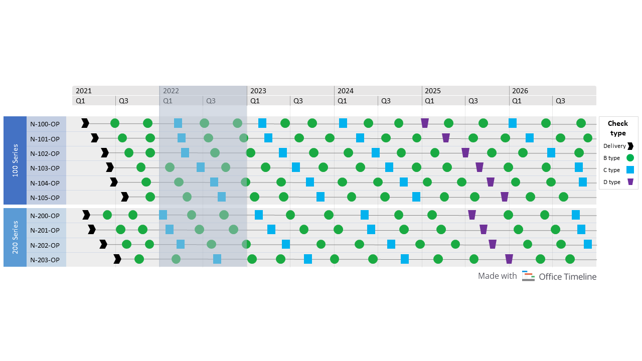 Since there were three types of maintenance tasks (B-check, C-check, and D-check), Stephen chose different colors and shapes to make them easier to identify. Also, he used PowerPoint built-in functionality to highlight the year 2022 so that current-year maintenance activities remain the focus of the report.