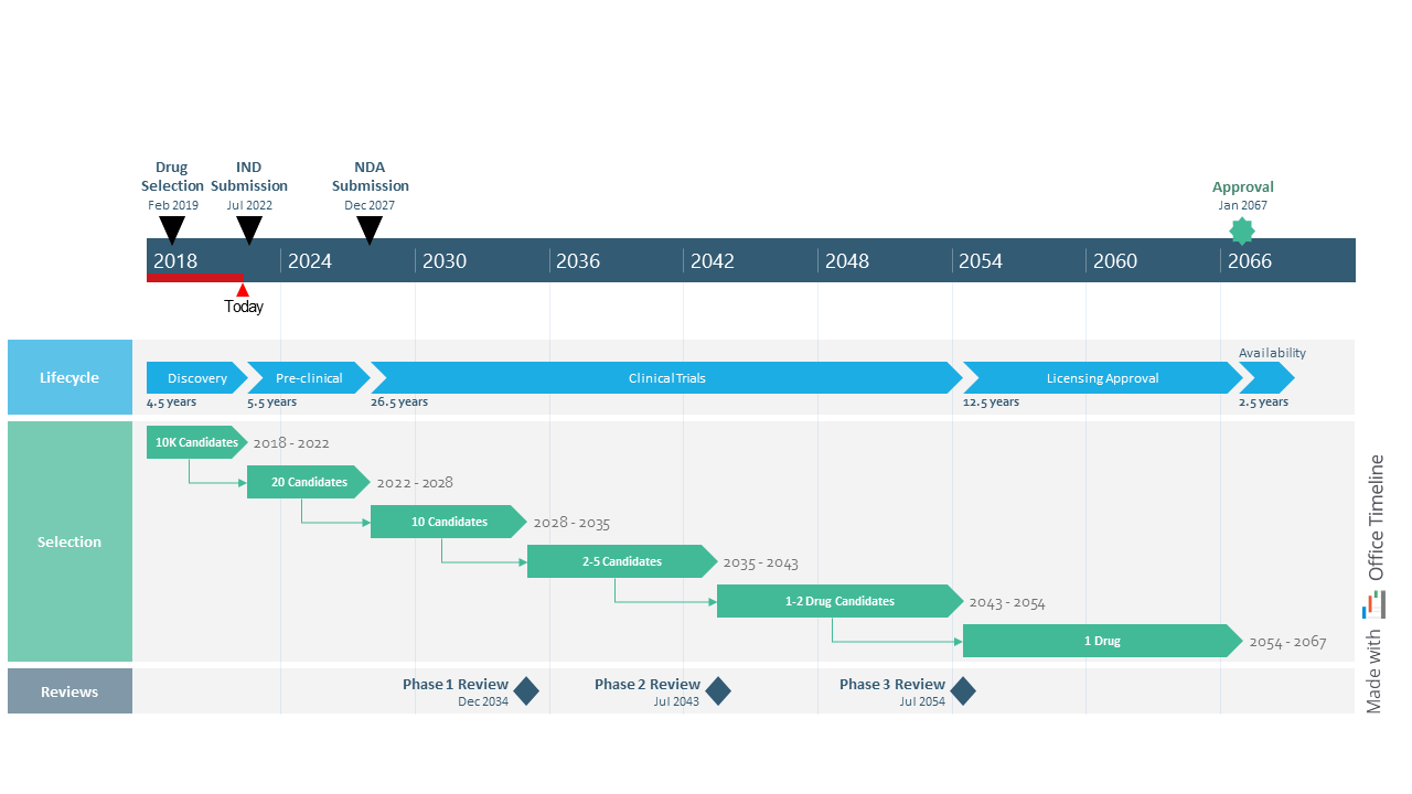Drug discovery and development projects, in particular, require careful planning, ongoing milestone tracking, and overall clarity of timelines and process stages spanning multiple years. These tasks can be successfully achieved with the help of a visualization tool like Office Timeline that enables you to easily create and maintain professional-looking project visuals.