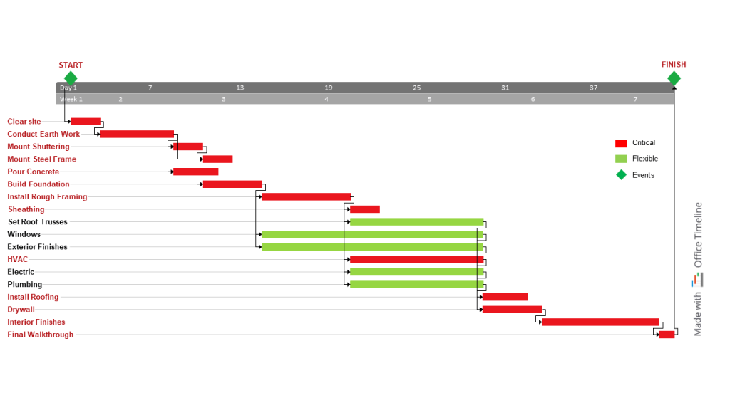 - The project’s essential tasks are arranged in clear, logical sequences. For instance, in the construction of a house, the foundation must be laid before the walls are erected.